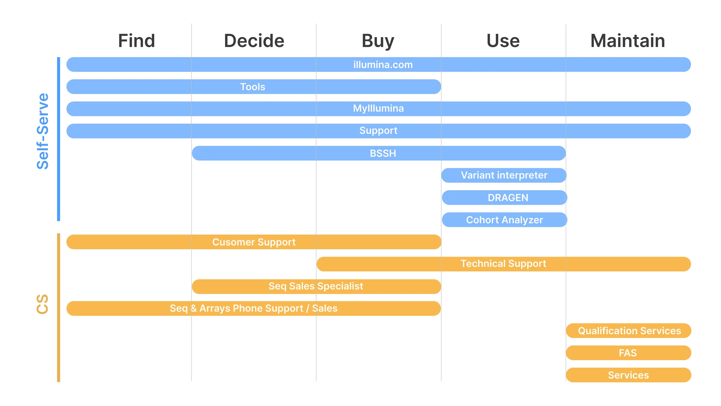 We are one swim lane in the user’s eyes. This view allowed us to clearly see how we support the user journey, where it overlaps, and acted as a foundation for how we measured our efforts while improving the experience together.
